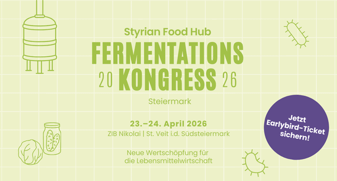 Am 23. und 24. April 2026 ist es so weit: Wir spannen den Bogen von der traditionellen Fermentation bis hin zu modernsten High-Tech-Proteinen aus dem Bioreaktor. Erstmals kommen Expertinnen und Experten, Produzentinnen und Produzenten sowie Innovationsbegeisterte aus ganz Österreich im ZIB Nikolai in St. Veit i.d. Südsteiermark zusammen, um zwei Tage lang praxisnahe Einblicke in die wirtschaftlichen und technologischen Potenziale der Fermentation zu gewinnen.